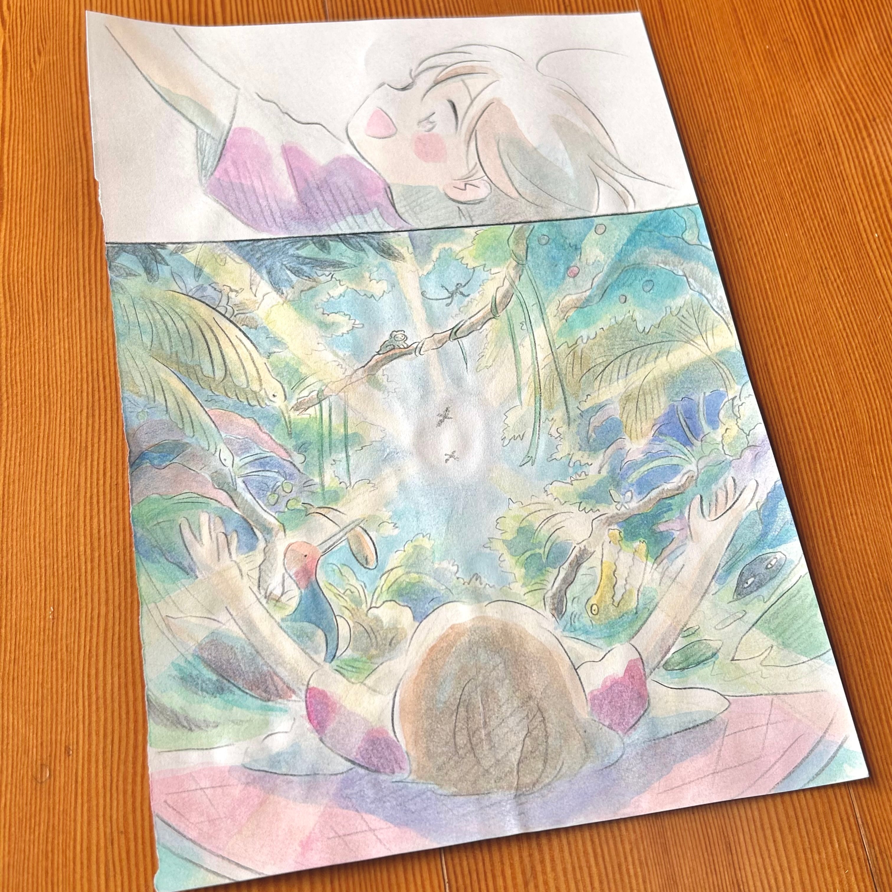 布団はボートとなって、ジャングルの生い茂る緑の中たくさんの生き物を眺めながら流れていく。
