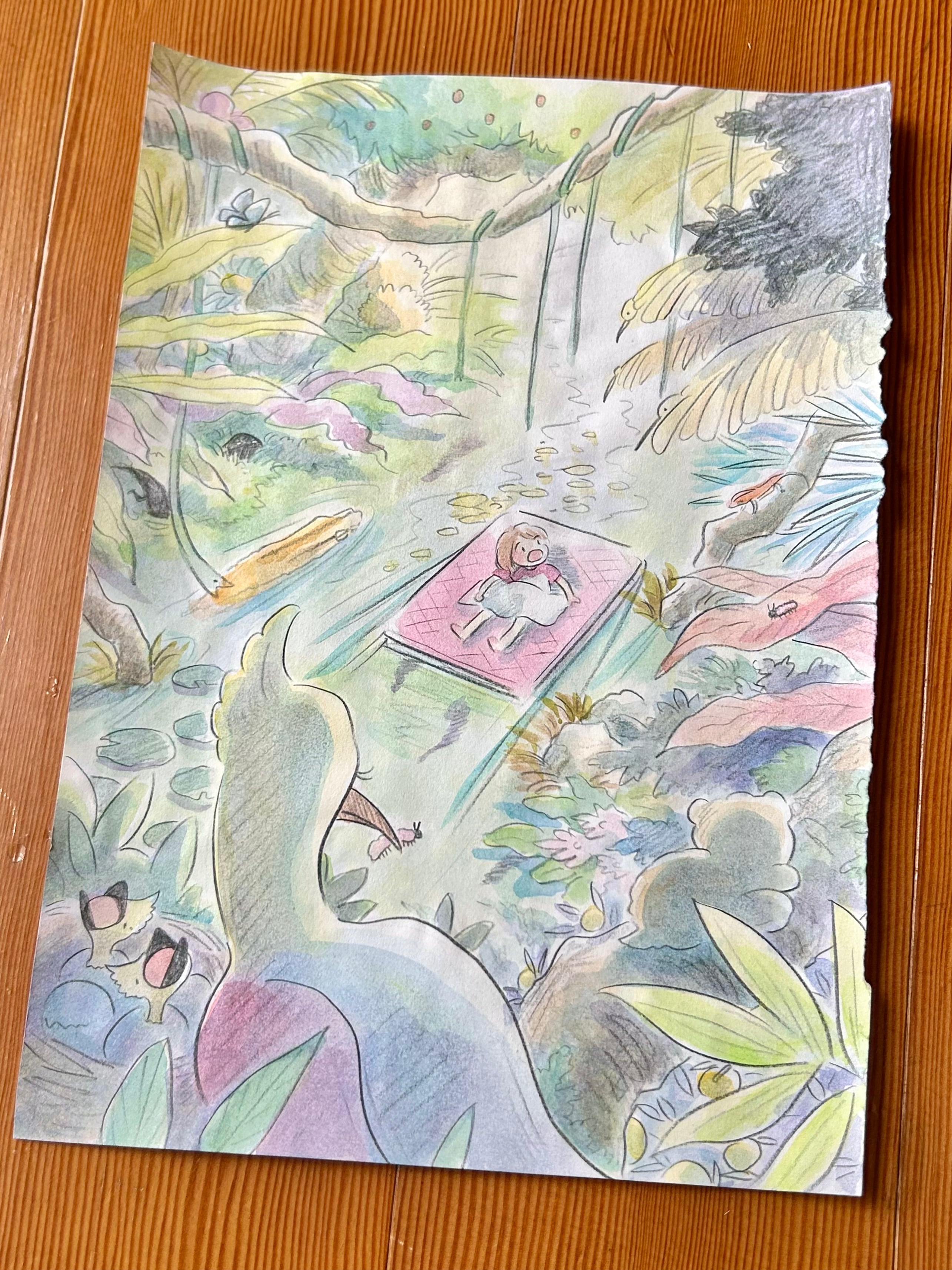 布団はボートとなって、ジャングルの生い茂る緑の中たくさんの生き物を眺めながら流れていく。